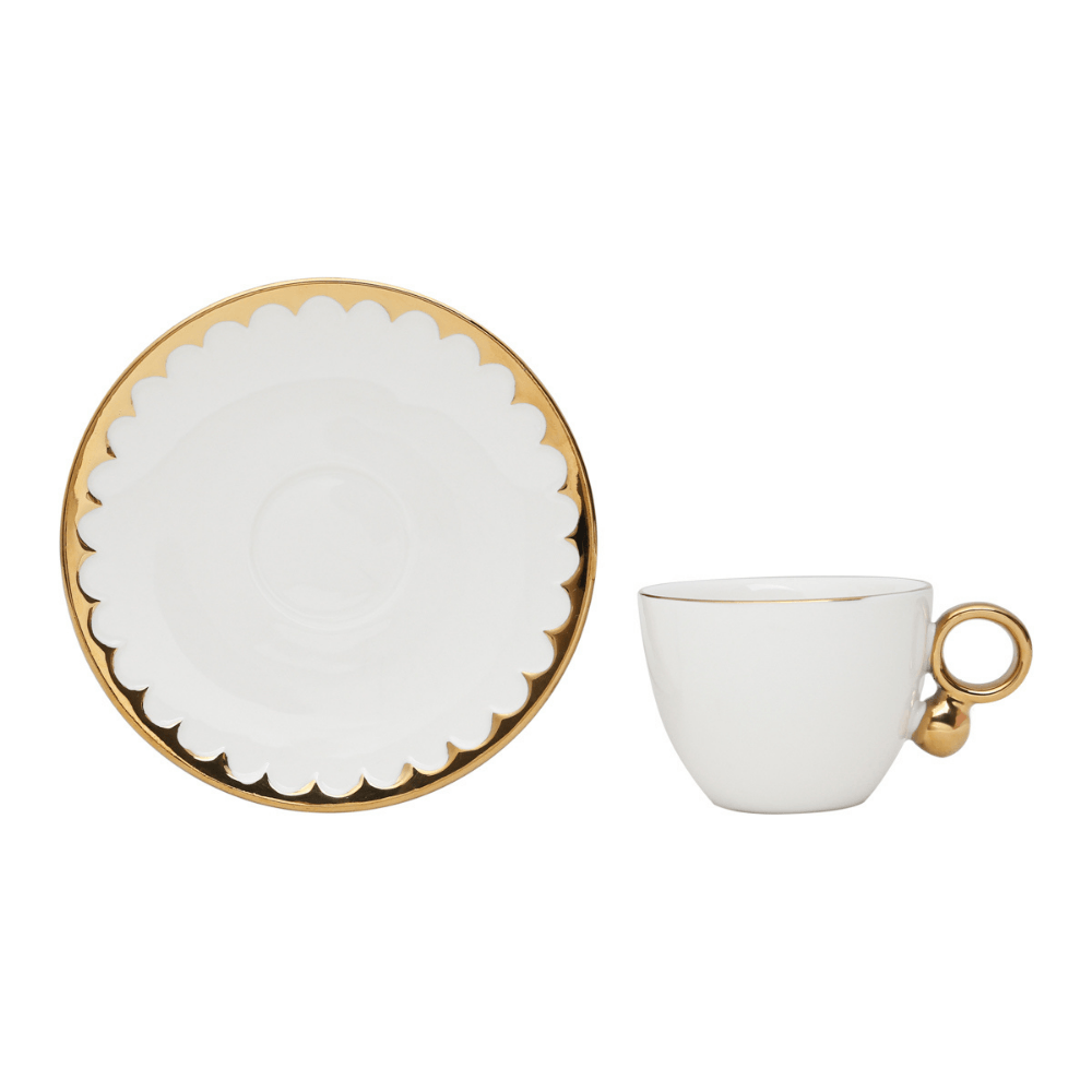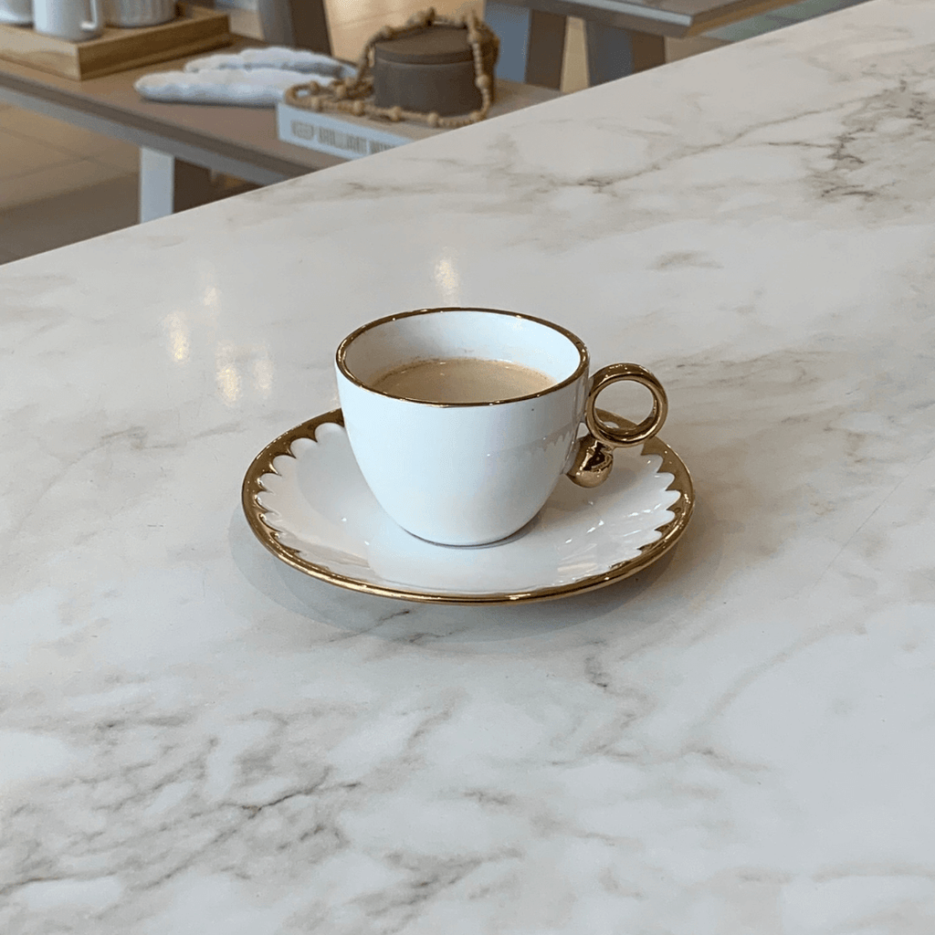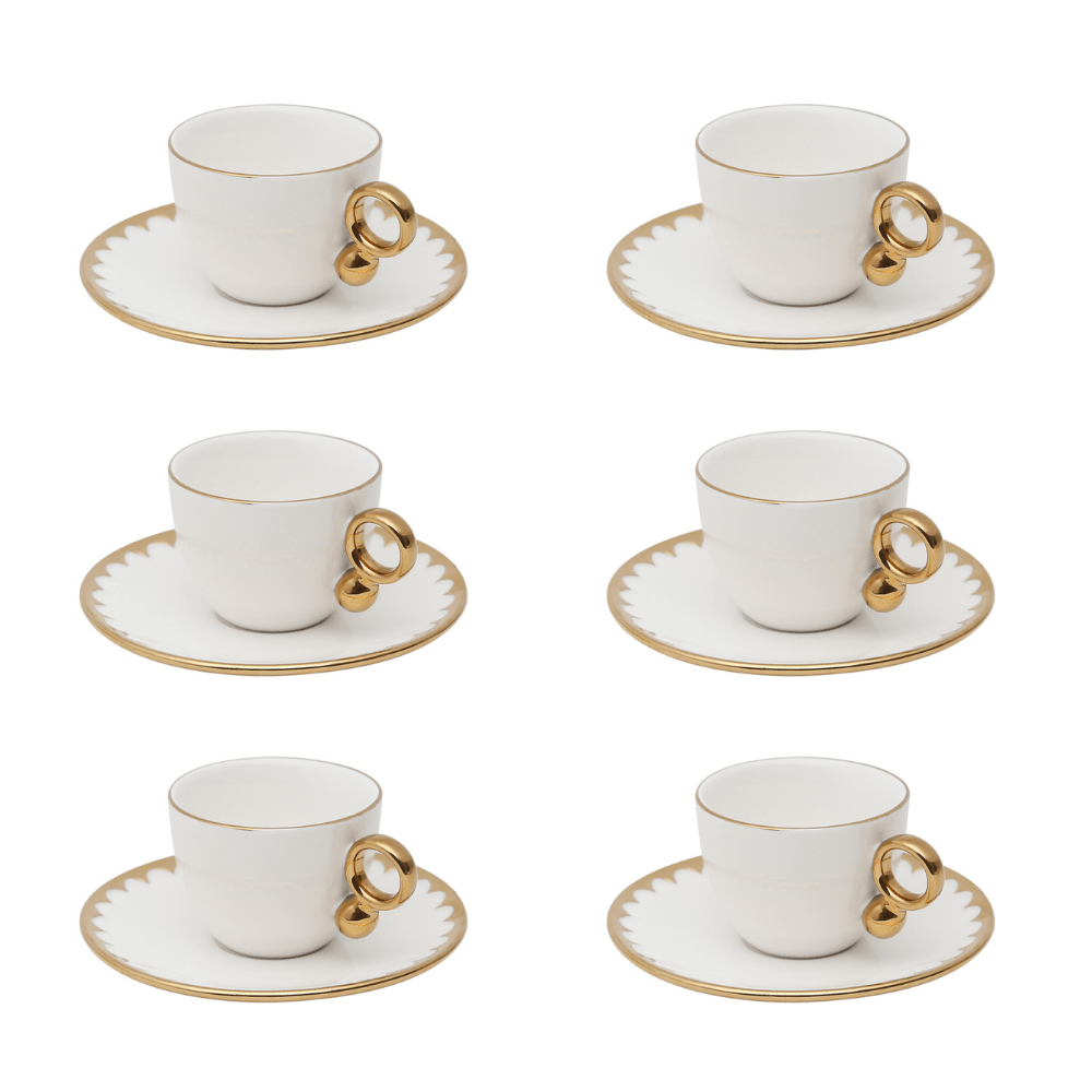 - Cada xícara de café é confeccionada em porcelana, esse jogo de xícaras e pires ainda possui um acabamento branco e dourado que confere beleza e sofisticação;