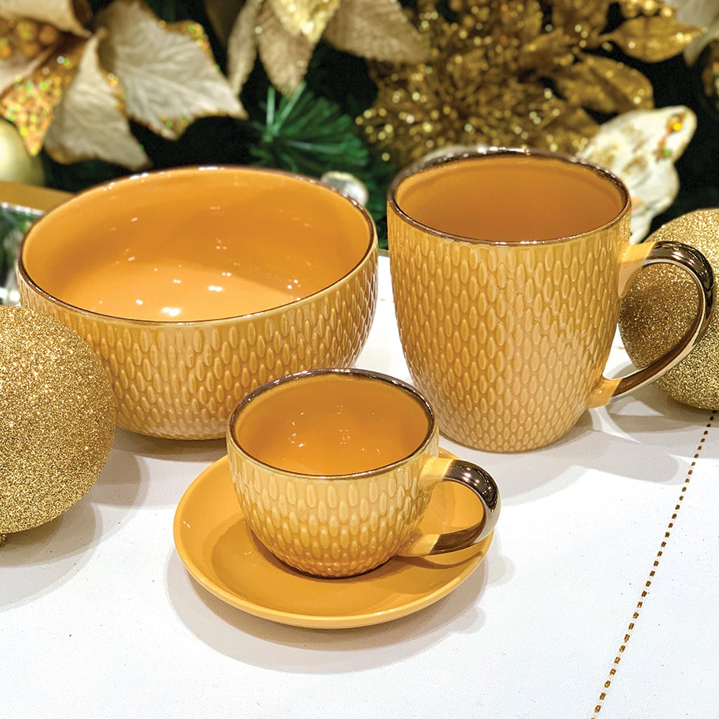 O momento de servir com um toque especial! A linha Drops em Porcelana chegou para trazer charme e delicadeza na sua mesa posta. O conjunto de xícaras no Amarelo, possui um lindo acabamento com brilho e textura diferenciados. Os detalhes no acabamento metálico na borda e alças das xícaras trazem elegância para qualquer momento! As cores brilhantes da linha conferem vida para o ambiente e ficam incríveis com outros produtos da mesma linha no Azul, Verde e Laranja.Benefícios do Produto • Cores vivas e elegantes; • Material de alta qualidade; • Acabamento metálico que confere charme para peça; • Versatilidade na hora de combinar com outras cores da linha; • Modernidade e delicadeza. Características do Produto Material: Porcelana Cor: AmareloDimensões Altura: 5 cmLargura: 9 cmComprimento: 7 cmCapacidade: 90 mlDicas de uso • Lavar com detergente neutro e esponja; • Não levar a máquina lava-louça. Conteúdo da Embalagem 4 pires e 4 xícaras.