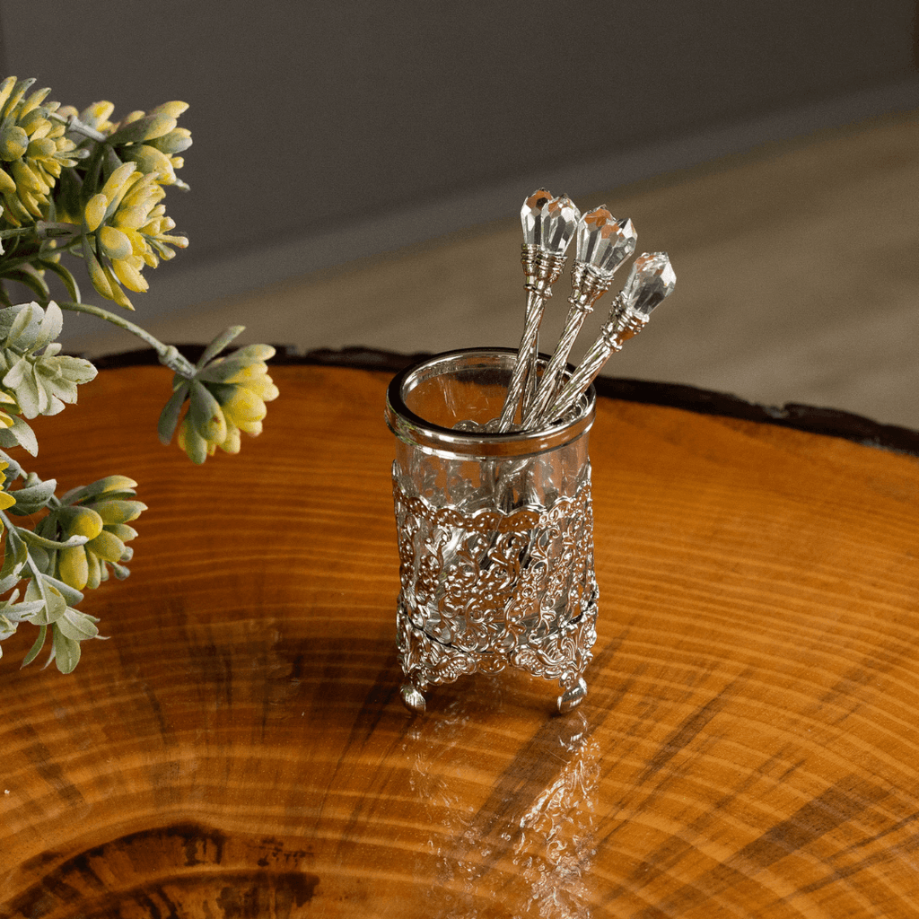 Encante seu espaço de maneira elegante, sofisticada e eficiente com o Conjunto 6 Colheres com Suporte Crystal Niquelado Zamac 14cm.
