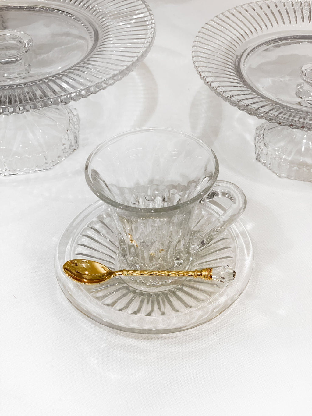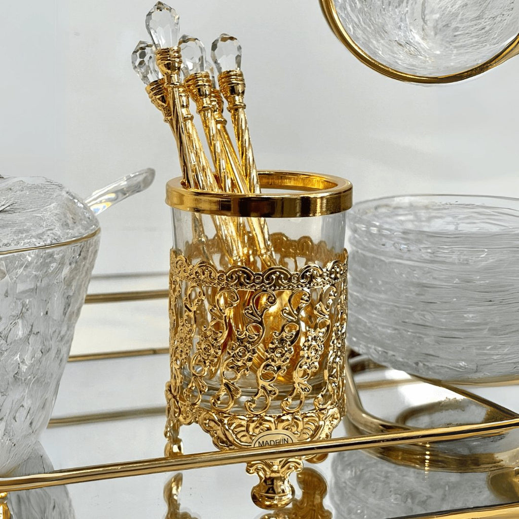 - O copo sai da base e as colheres tem um detalhe todo especial, cabo dourado torcido com um cristal na ponta, dando um visual delicado e charmoso;