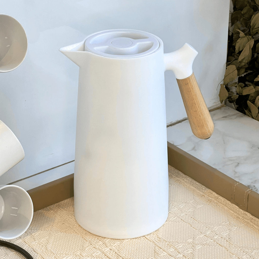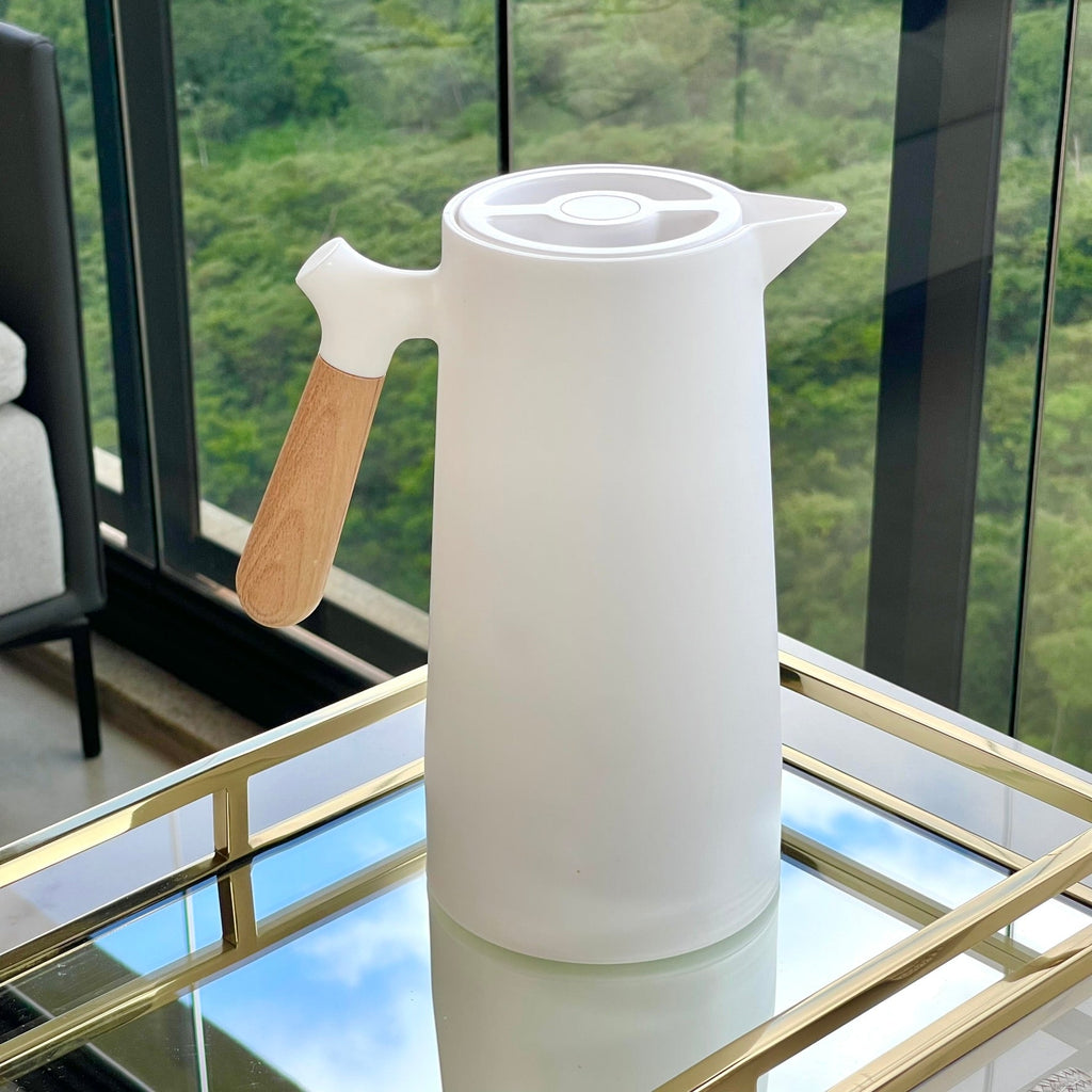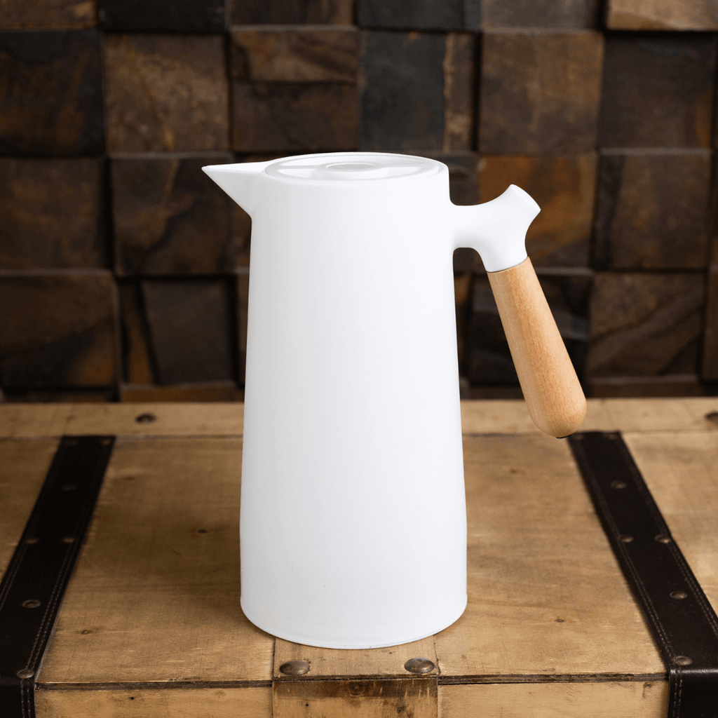 Charme, elegância e funcionalidade são características da Garrafa Térmica Nórdica Branca com Cabo de Madeira 1 Litro.