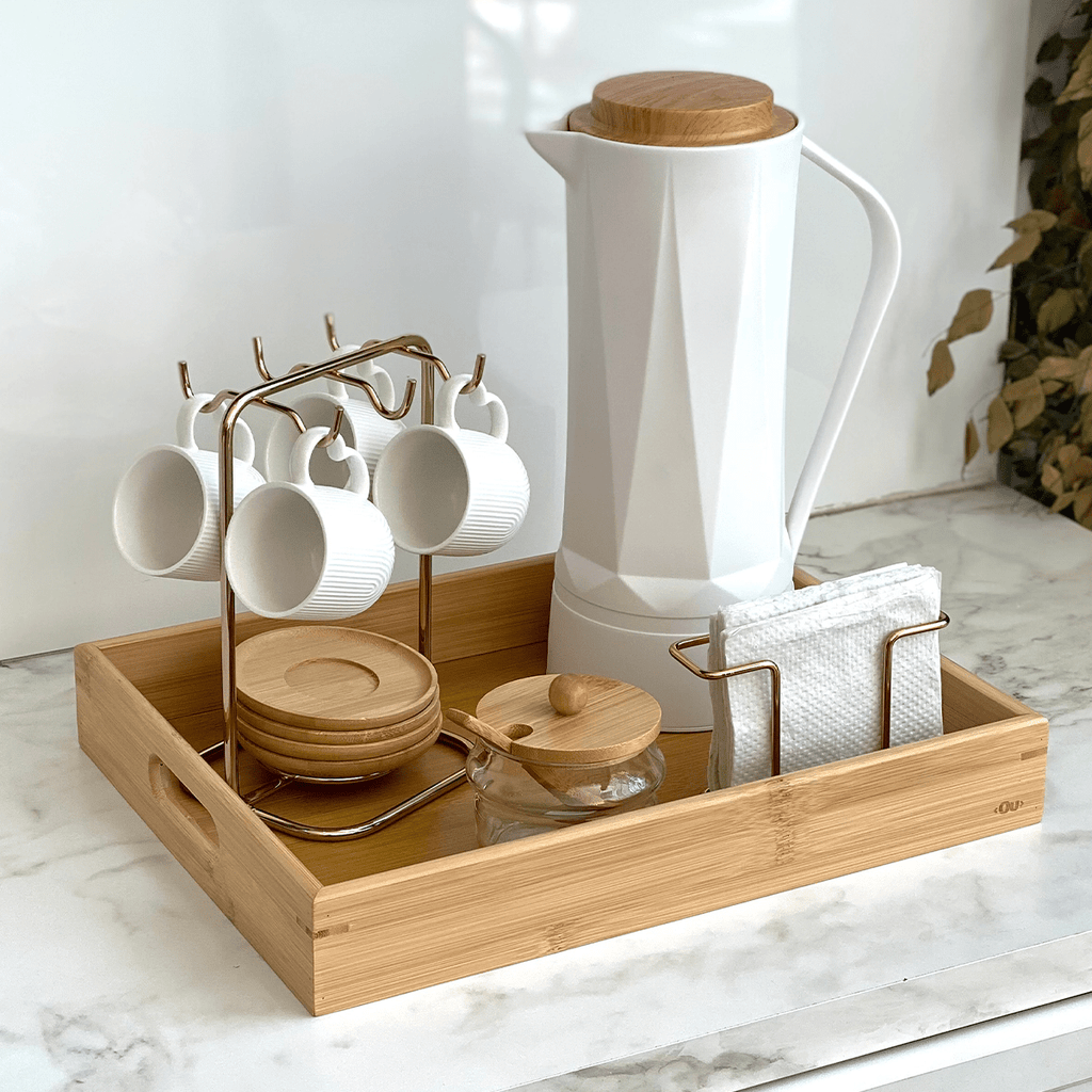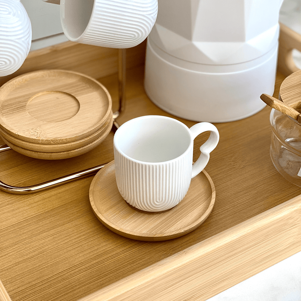 • Fabricado em bambu que oferece conforto para apreciar uma bebida quente, pode ser usado para servir chá, café e até mesmo cappuccino.