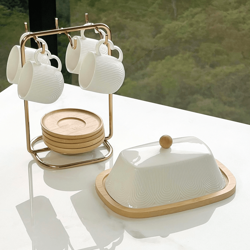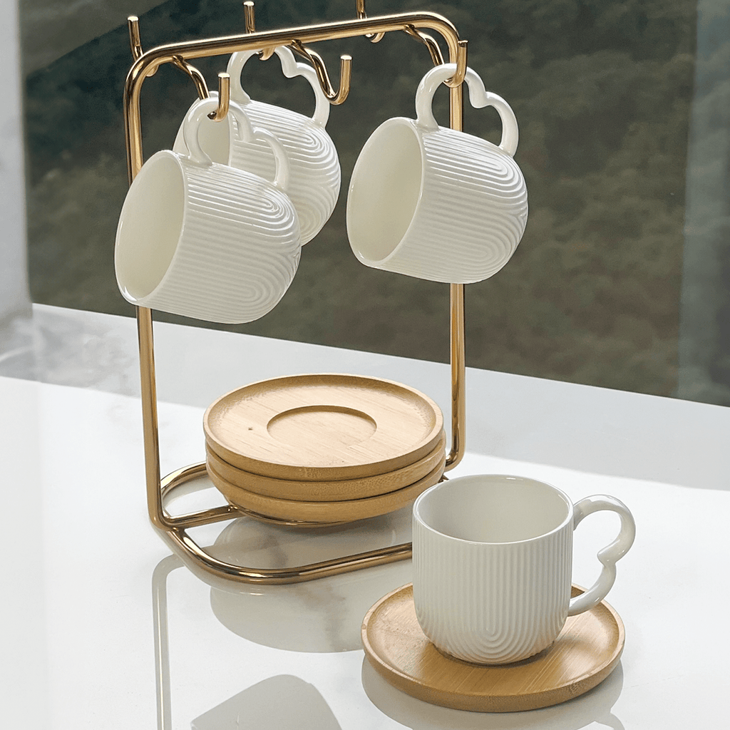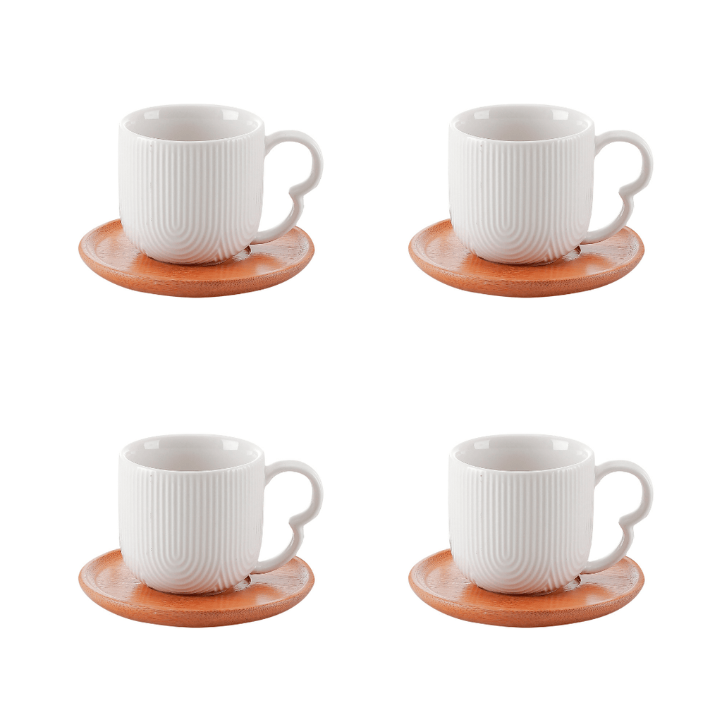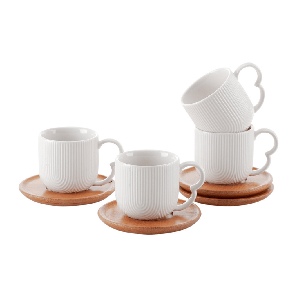 •  Cada xícara do conjunto é fabricado em cerâmica de qualidade com acabamento branco e design canelado;