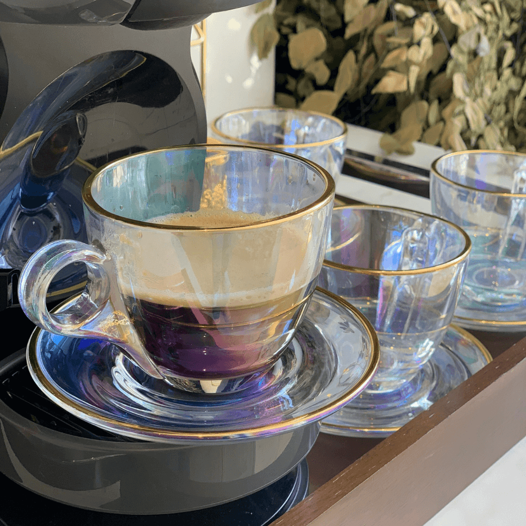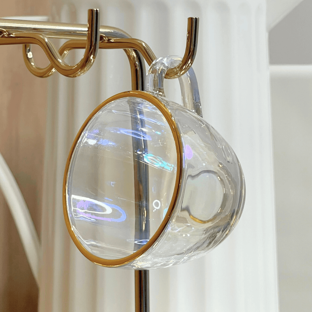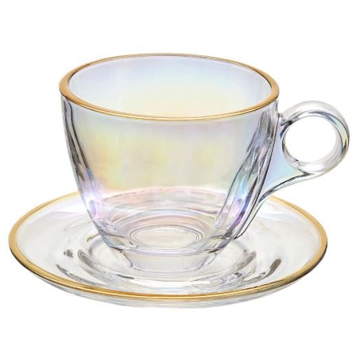 - A borda da xícara e do pires possui um fio na cor dourada que remete ao fio de ouro.