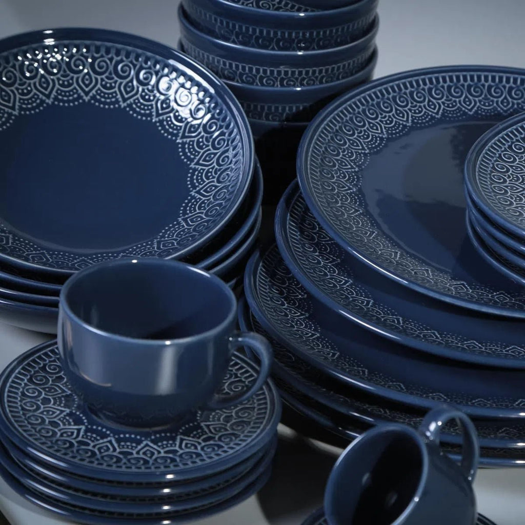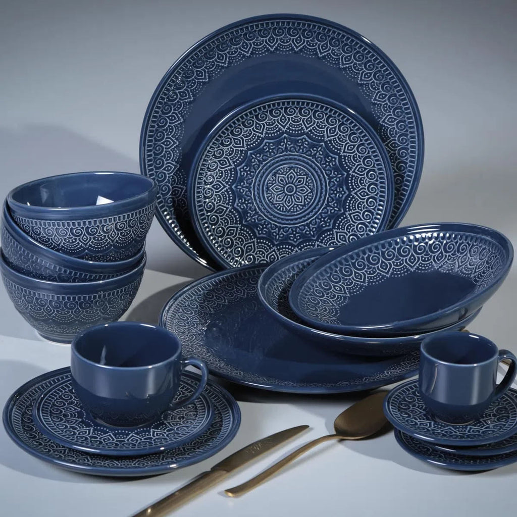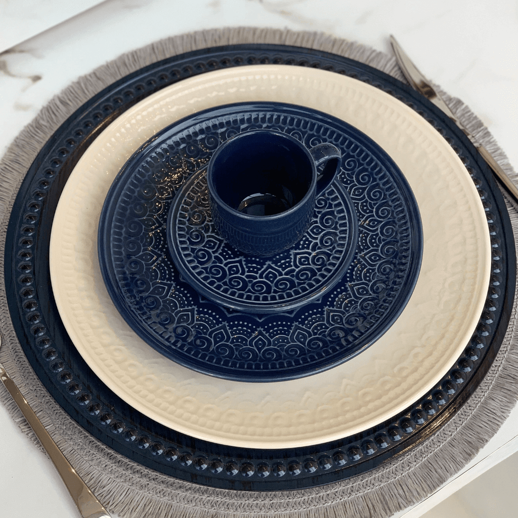 - Produzidas em cerâmica feldspática, são peças extremamente duráveis e possuem um acabamento em azul escuro super elegante