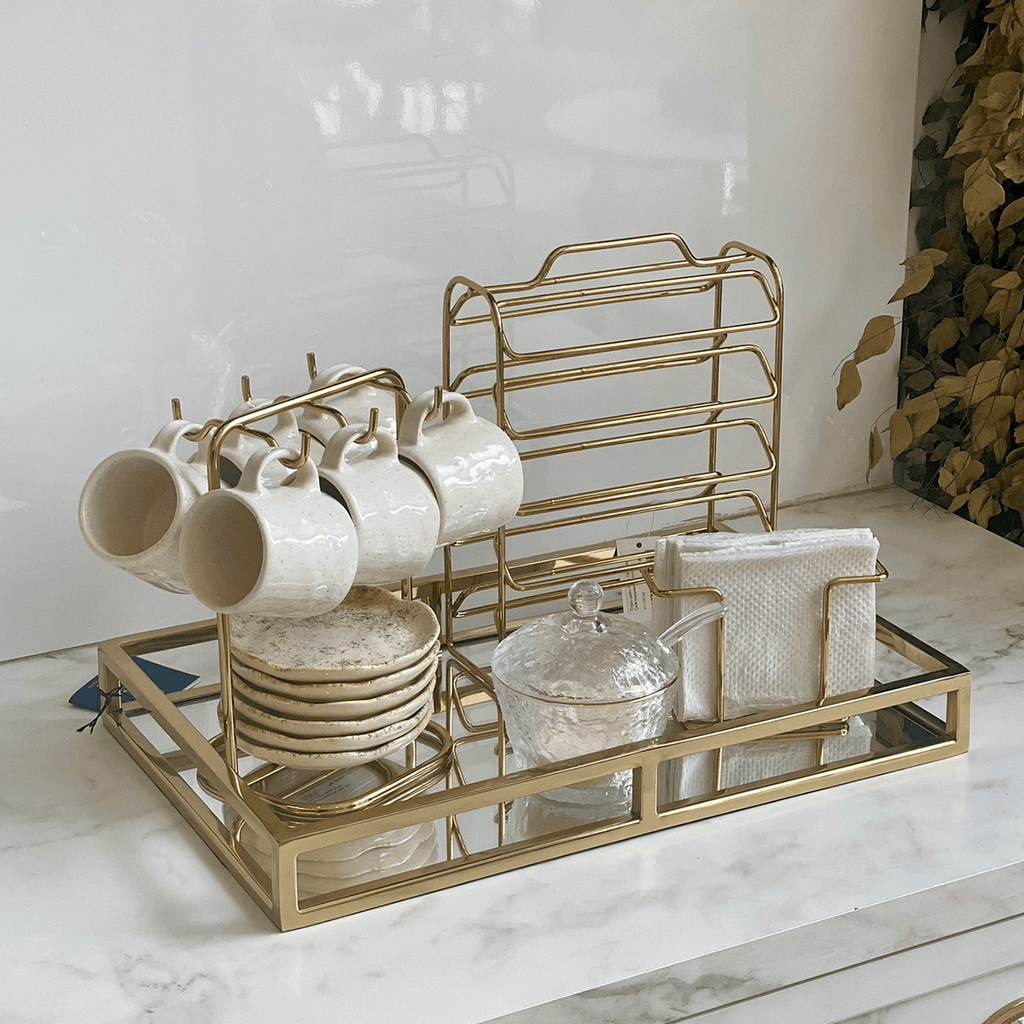 Super completo; possui seis pires elegantes com detalhes minimalistas na superfície e seis xícaras de café com alça ergonômica.