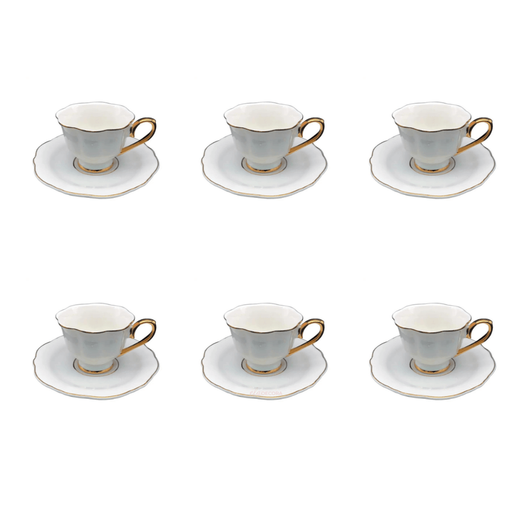 - Com um design encantador e detalhes em borda dourada, esse conjunto de xícaras e pires irá adicionar um toque de glamour à sua rotina de café;