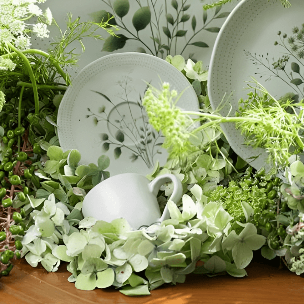 - O conjunto de xícaras possuem formas suaves e um design natural, decoradas com delicados detalhes de flores e ramos;