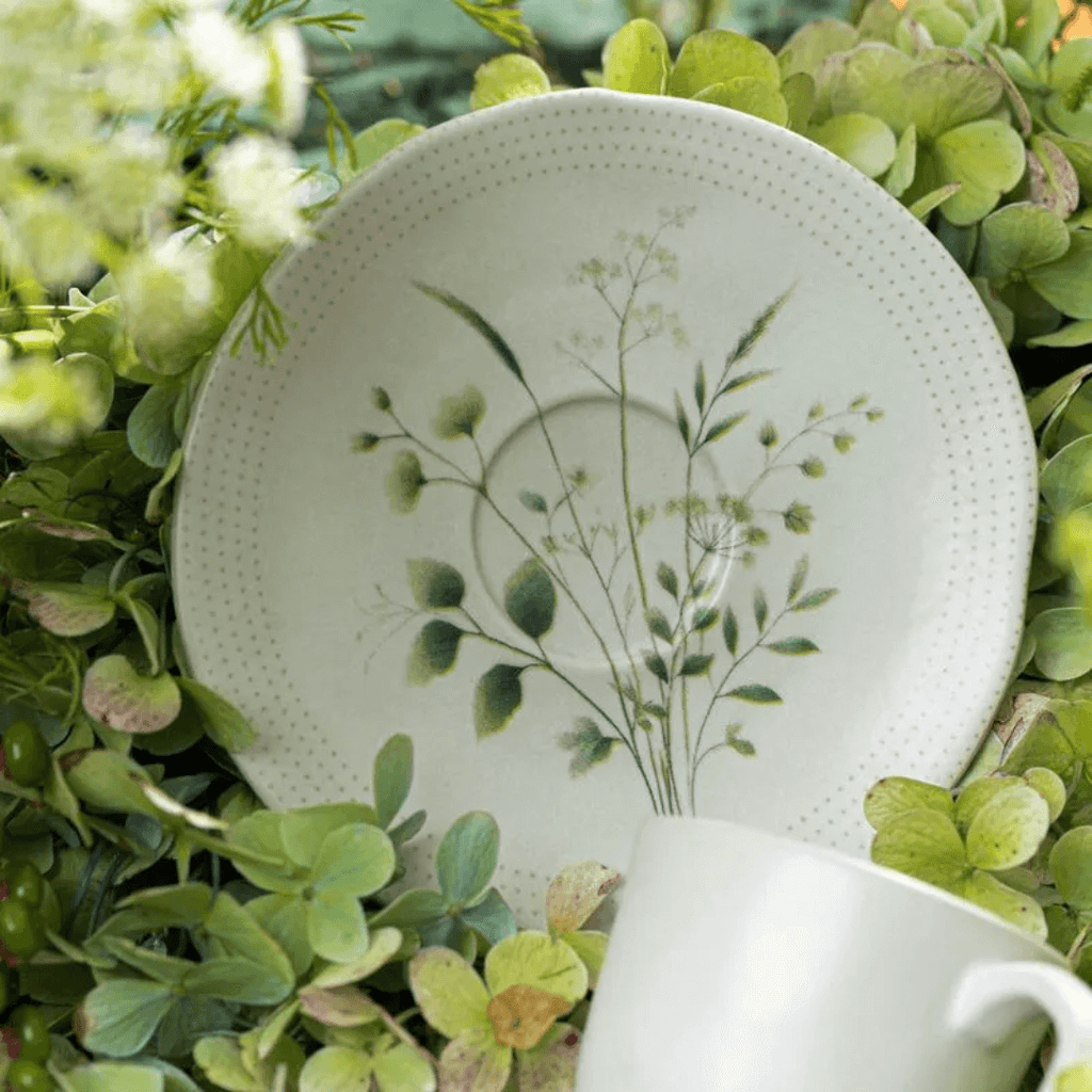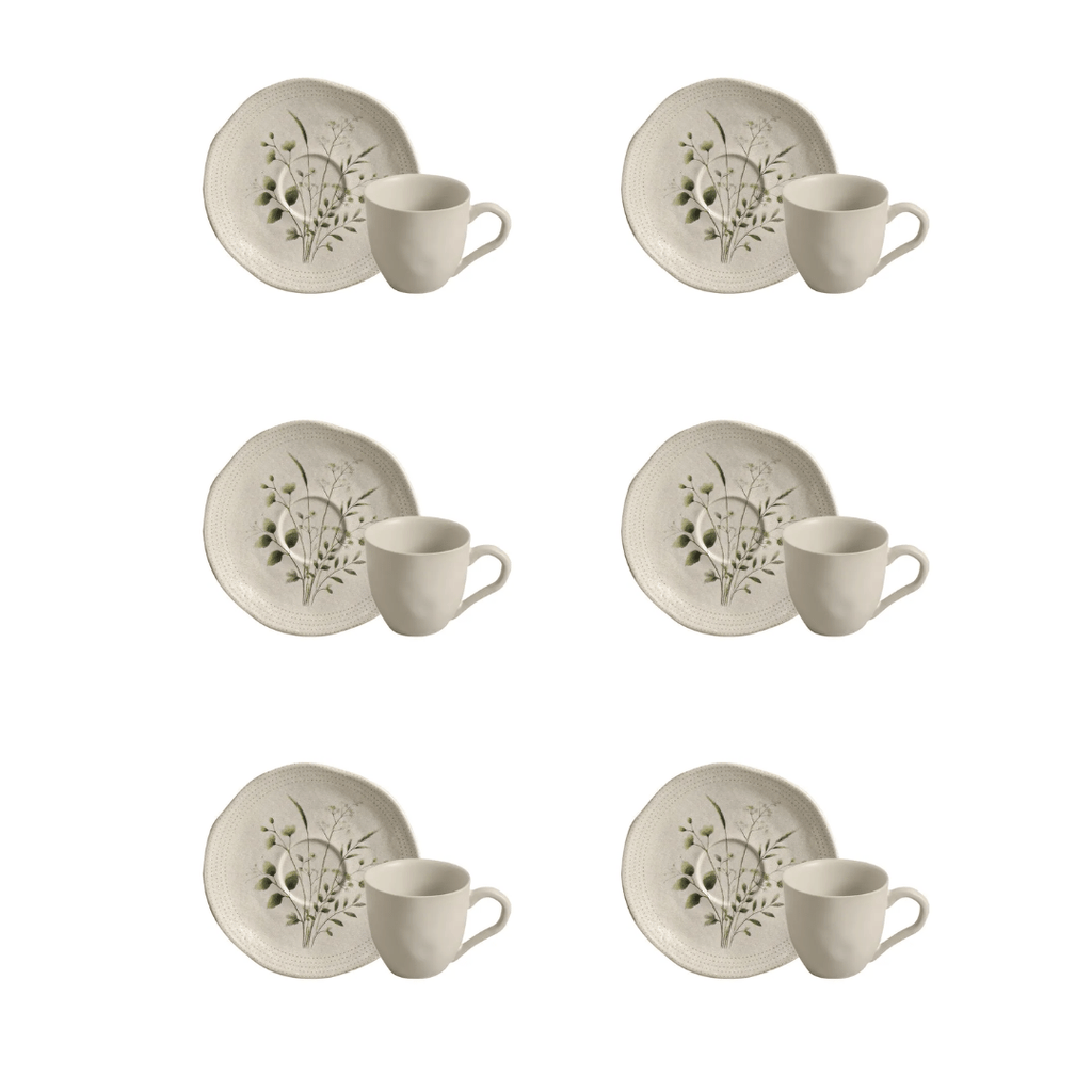 Desfrute do seu café com charme e elegância com o Jogo de 6 Xícaras de Café com Pires Orgânico Ammi Flores e Ramos 120ml.