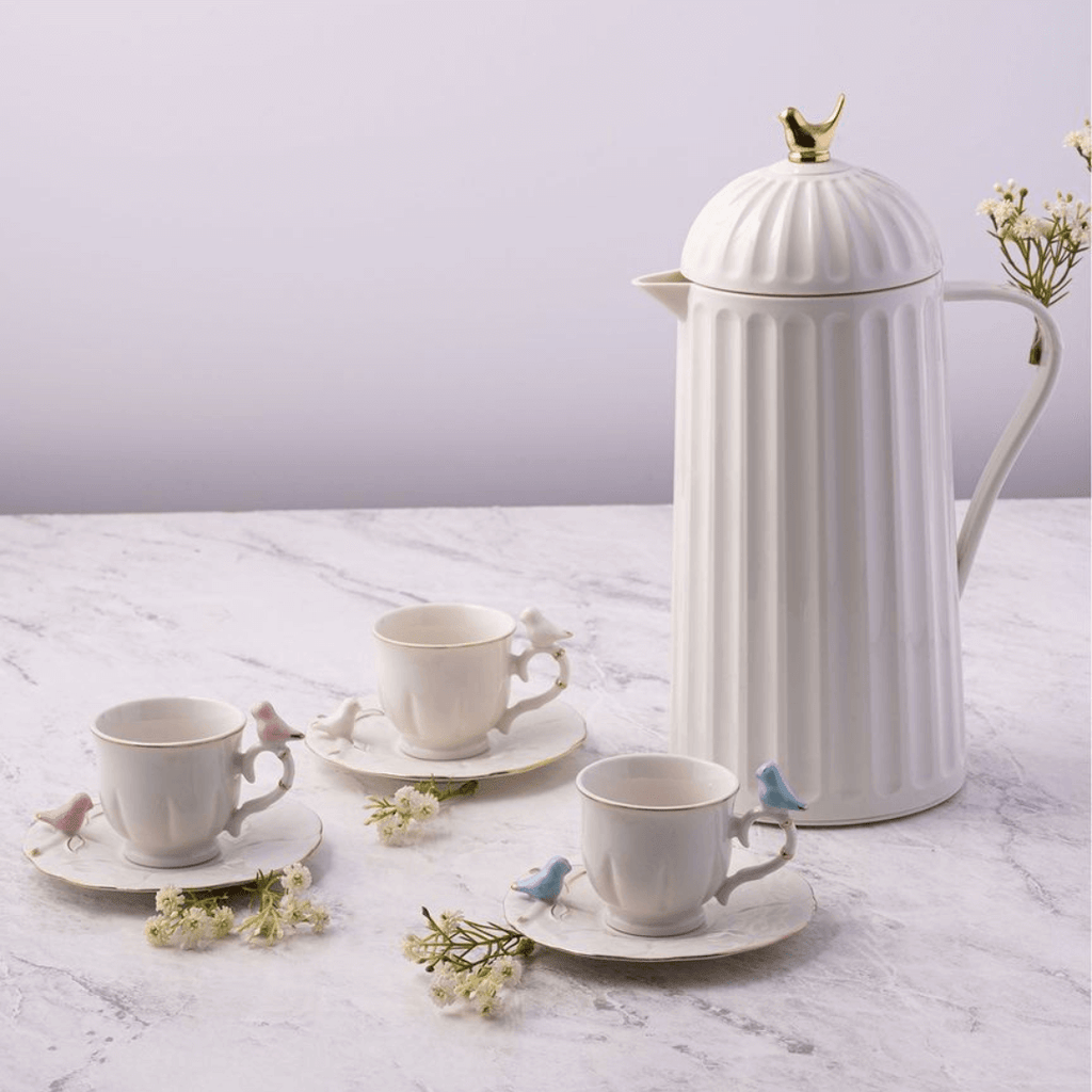 - As xícaras vêm acompanhadas de pires, que têm o tamanho ideal para acomodar as xícaras e também são decorados com lindos e pequenos pássaros coloridos;