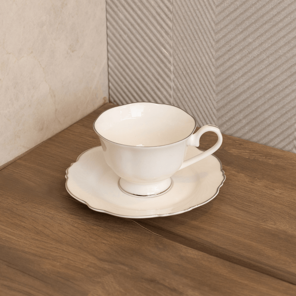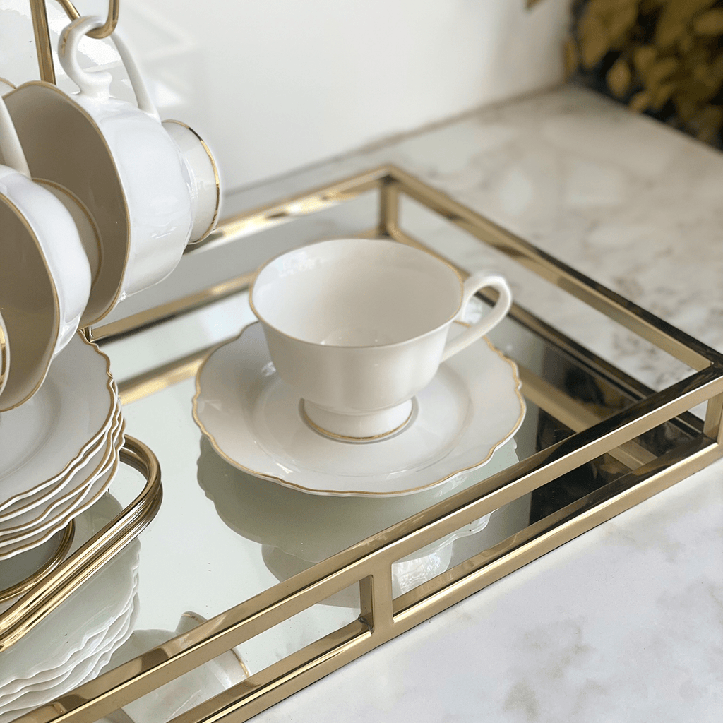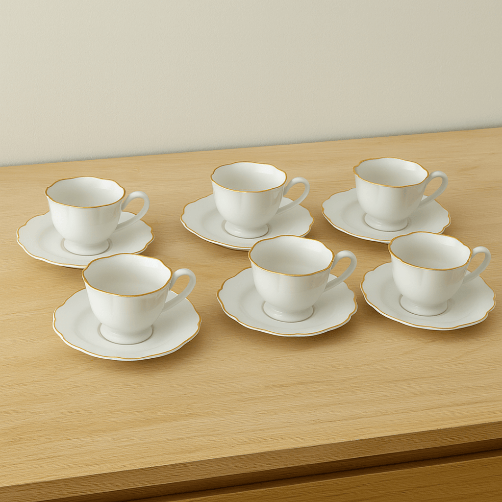 Este conjunto de 6 xícaras de chá com pires é elegante e luxuoso, com um toque de fio de ouro, é perfeito para desfrutar de uma xícara de chá quente enquanto desfruta de uma experiência sofisticada.