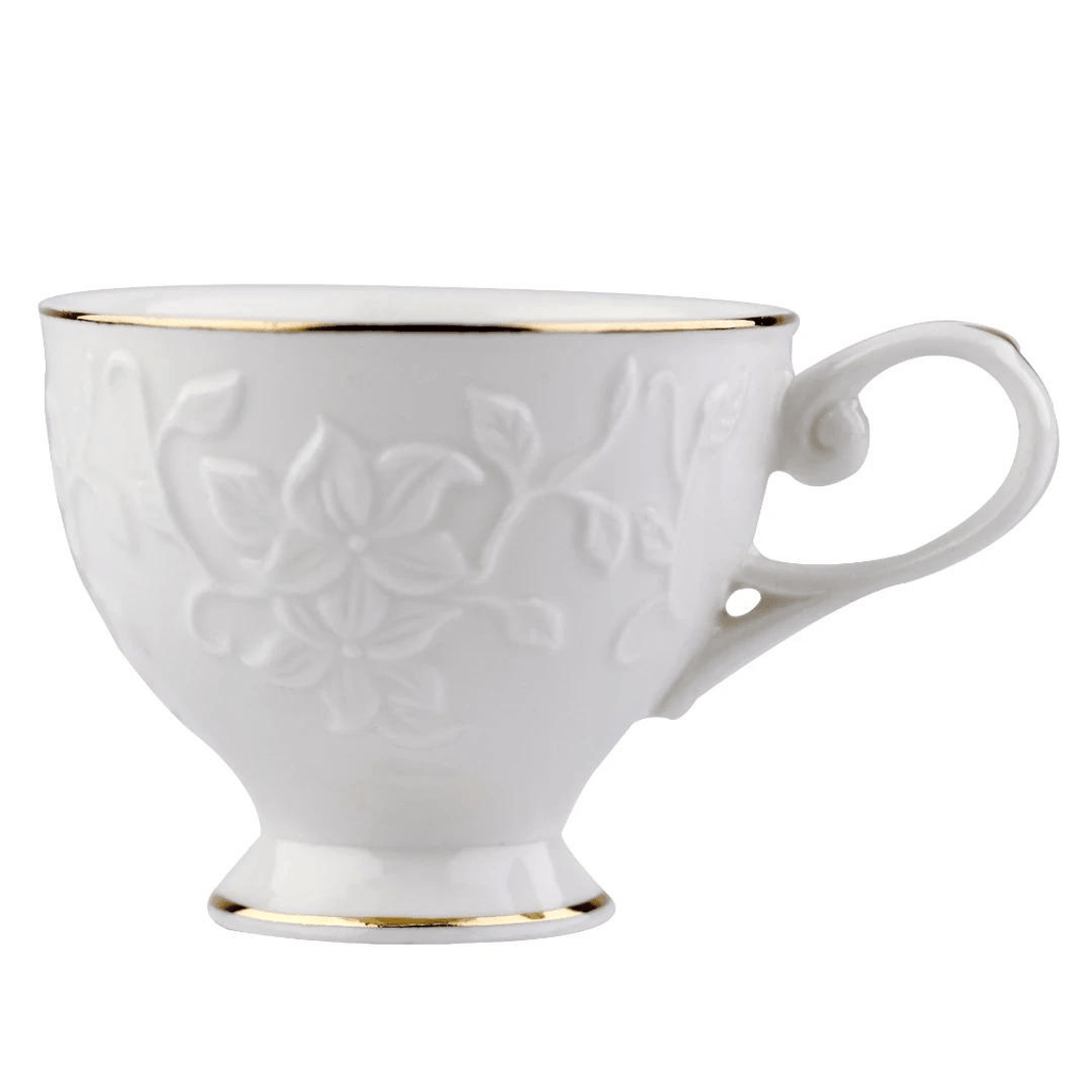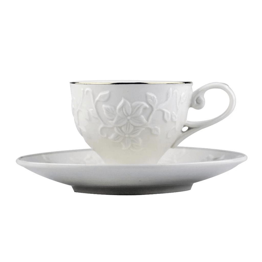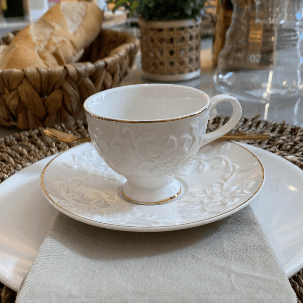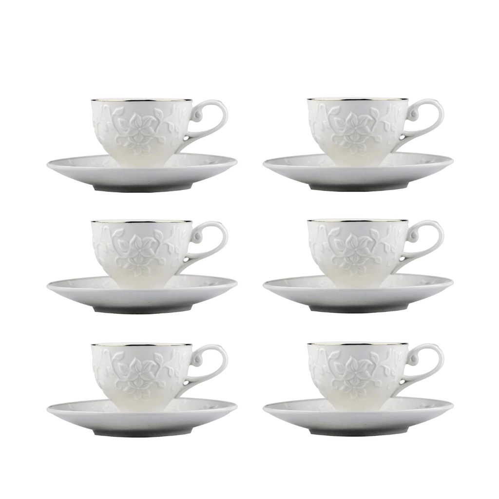 O Jogo 6 Xícaras para Café com Pires Scarlet New Bone Branco com Borda Dourada de 90ml é a escolha perfeita para aqueles que desejam adicionar um toque de elegância e glamour aos momentos de degustação de café. Com um design sofisticado, acabamento impecável e detalhes em dourado, essas xícaras e pires proporcionam uma experiência refinada e luxuosa.Seja para desfrutar de um café matinal revigorante ou para receber convidados com estilo, esse conjunto é o complemento perfeito para sua coleção de utensílios de café.Fabricadas em New Bone, uma porcelana de alta qualidade, as xícaras e pires desse conjunto são resistentes e duráveis.