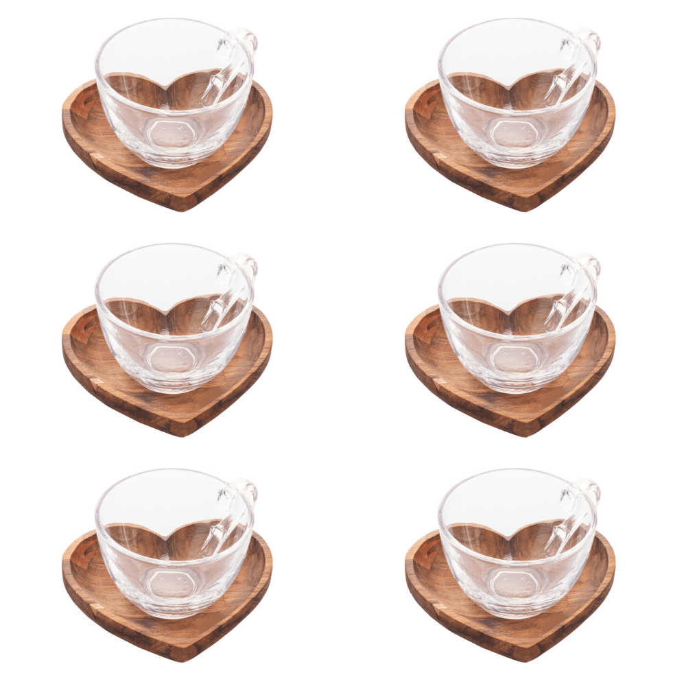 Jogo 6 Xícaras de Chá Com Prato em Madeira Teca Coração 190ml