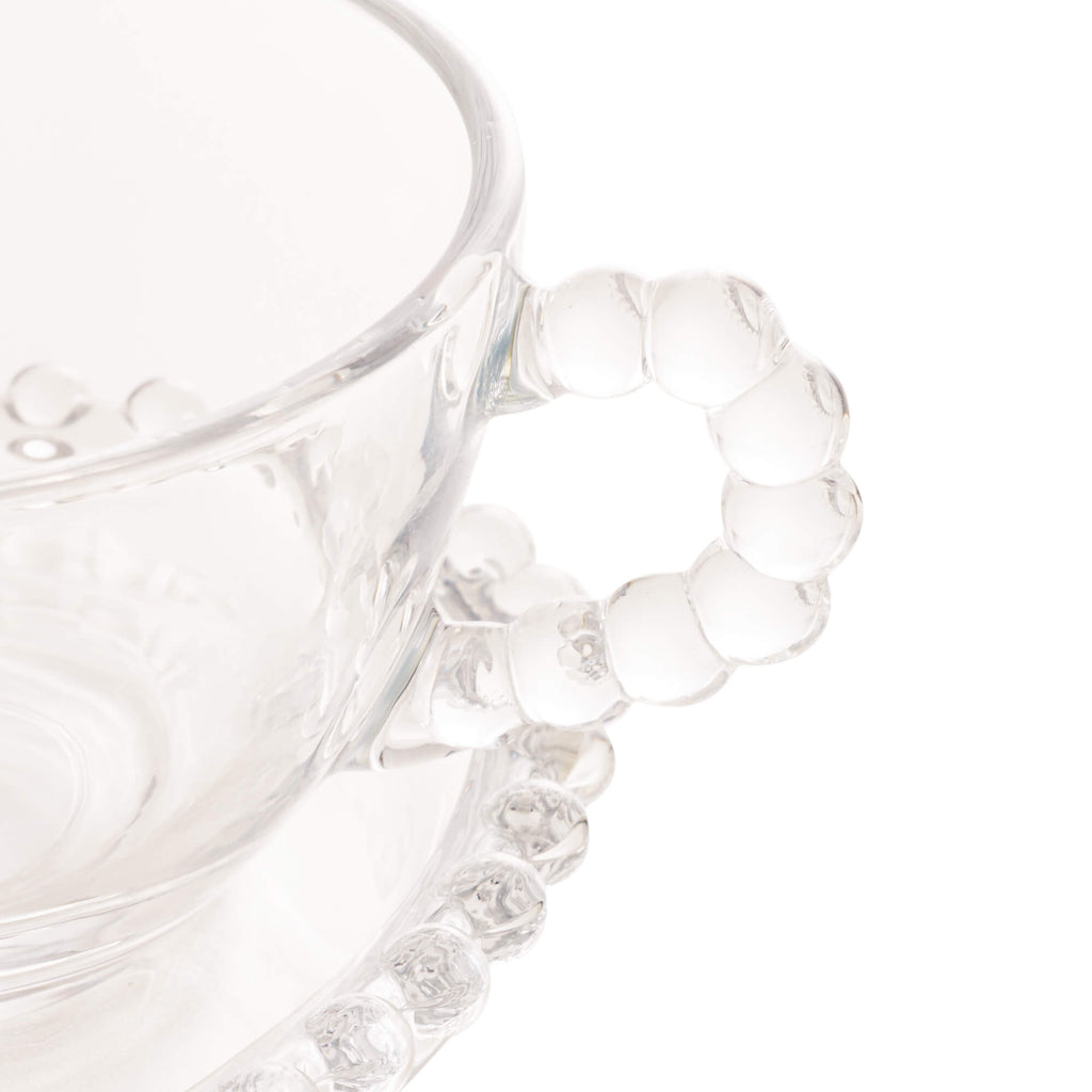- Possui bolinhas de cristais que remetem às brilhantes pérolas nas bordas do prato e na alça da xícara;