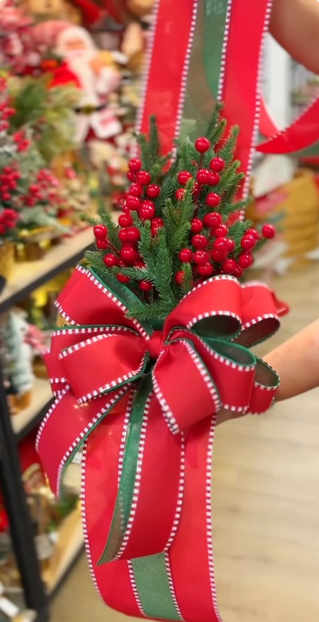 - Detalhes em pinheiro artificial e frutinhas decorativas