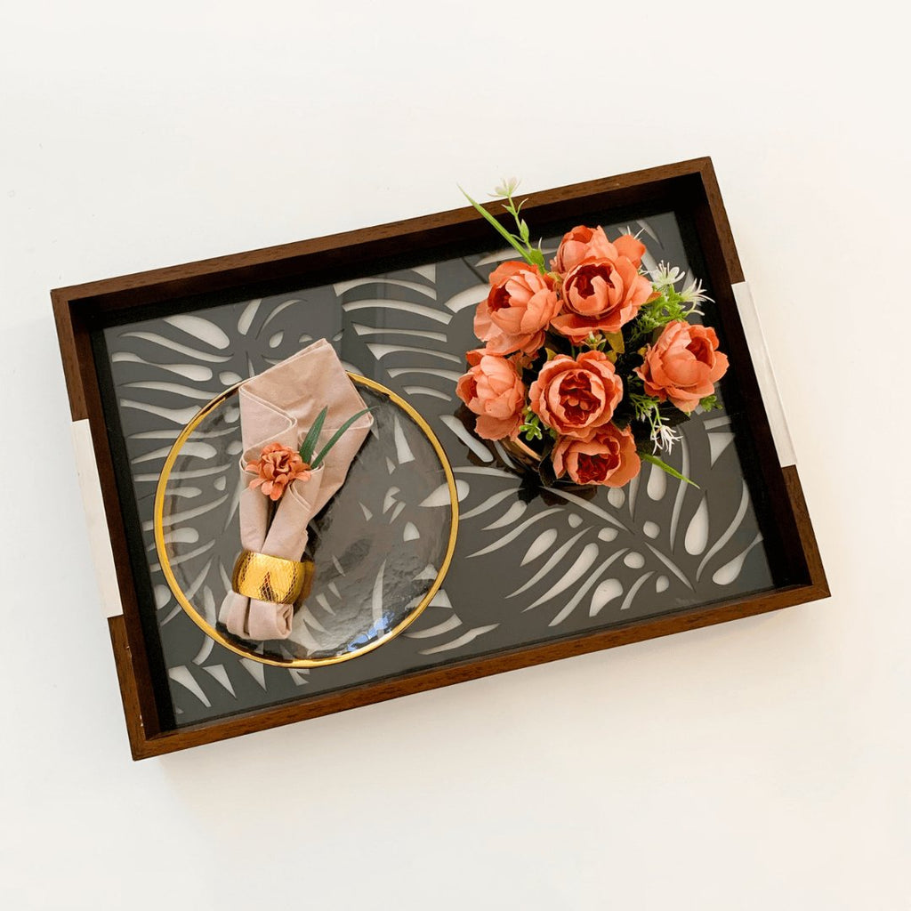 Bandeja Madeira Com Vidro Adam Preta 47 x 32 cm