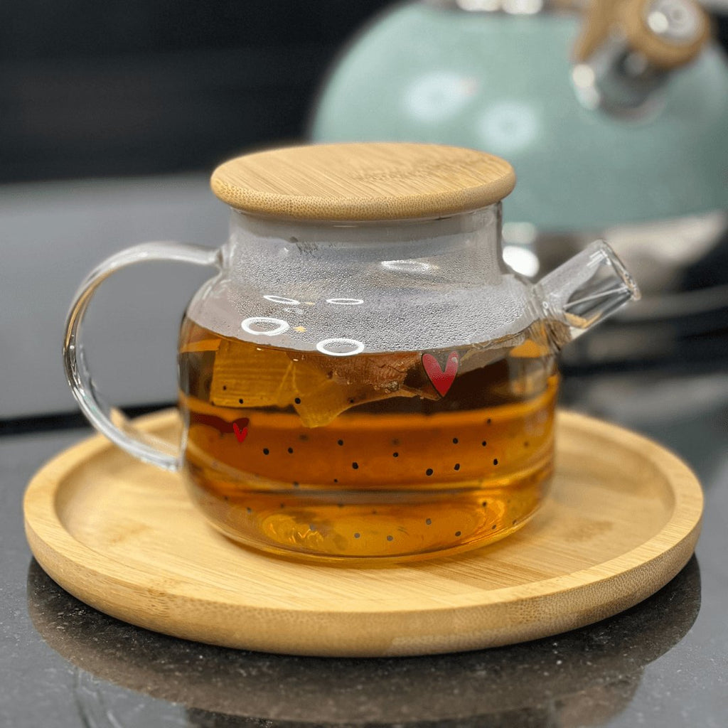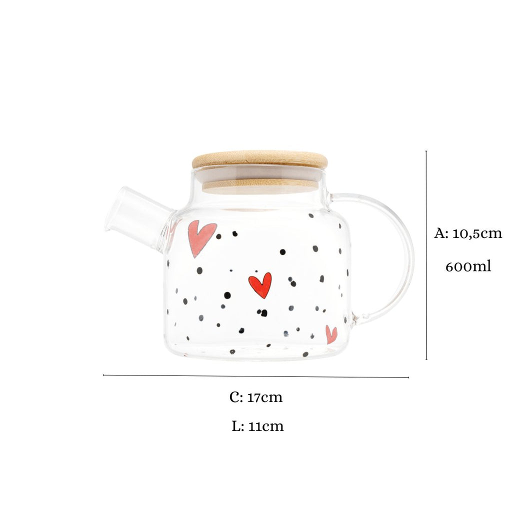 A chaleira de vidro com tampa é perfeita para servir seu chá de maneira sofisticada e elegante.Pode compor a decoração da sua mesa posta de café da manhã ou café da tarde. Pode acompanhar outros itens e combinar com diversos tipos de mesa posta.Confeccionado em vidro borossilicato transparente com detalhes de corações e pintinhas pretas, essa chaleira também possui uma tampa em bambu.Possui alça ergonômica e tampa de bambu, material ecologicamente correto que protege sua bebida com eficiência. Além de uma boa capacidade de 600ml.LUGARES RECOMENDADOS PARA USO:- Cozinha;- Mesa posta;