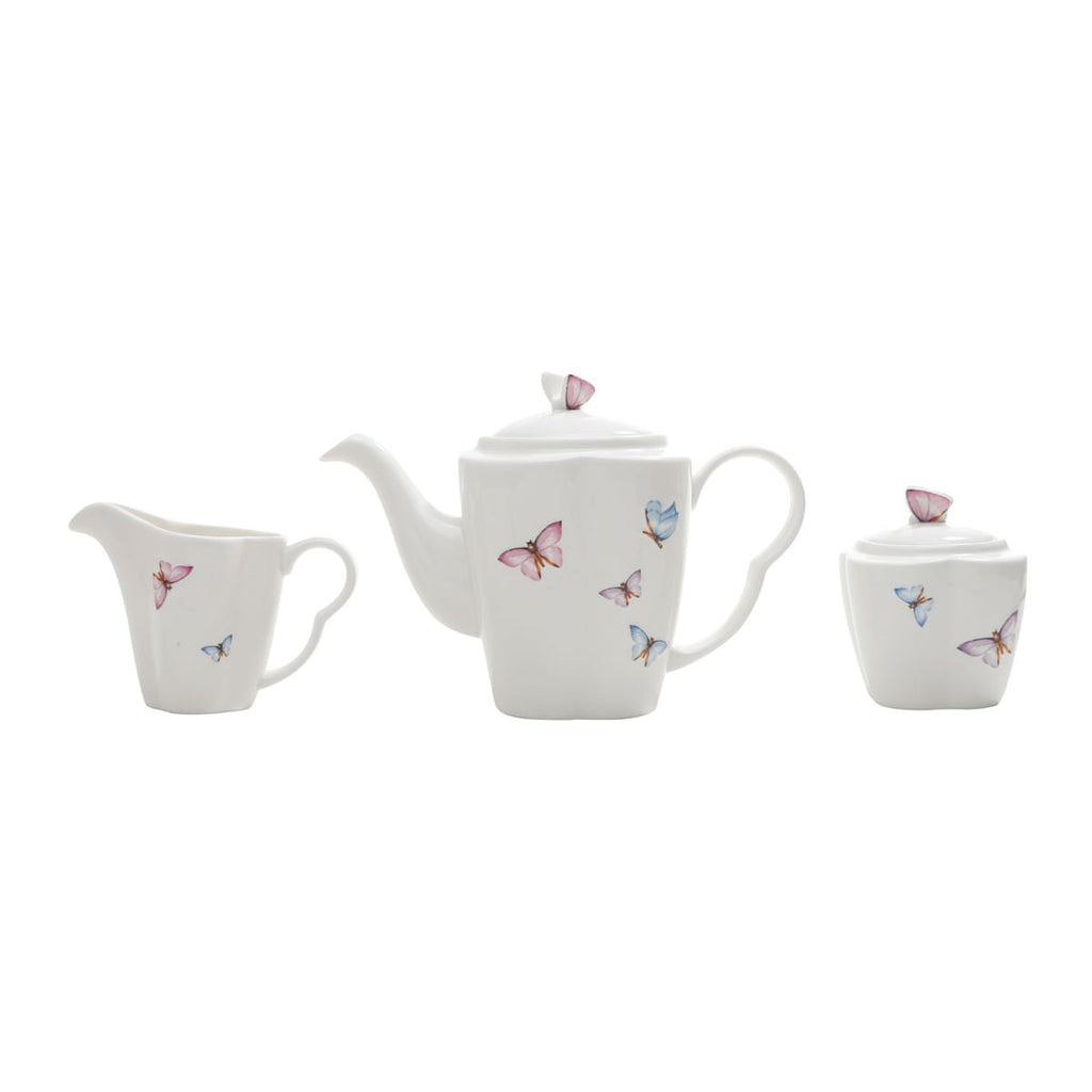 Conjunto para Café Bule Açucareiro Leiteira Porcelana Borboletas Branco 3 Peças