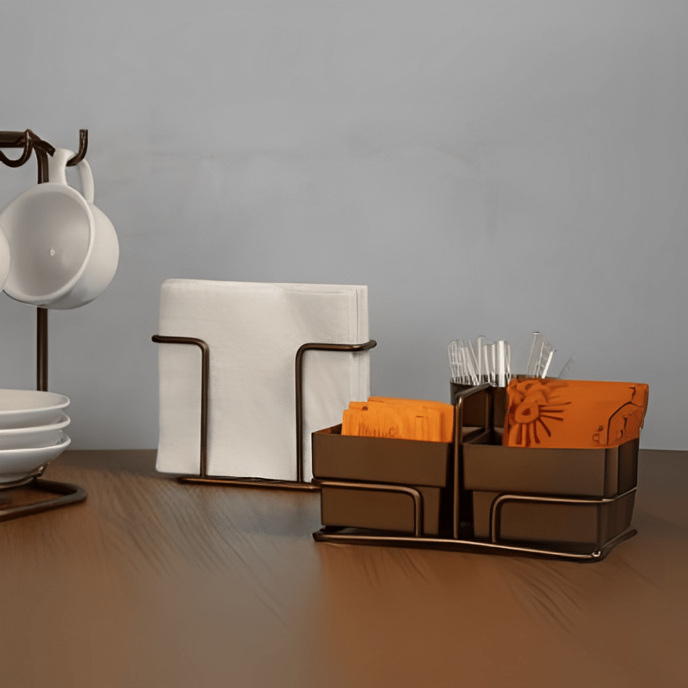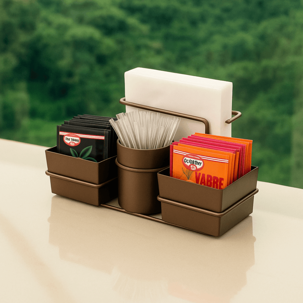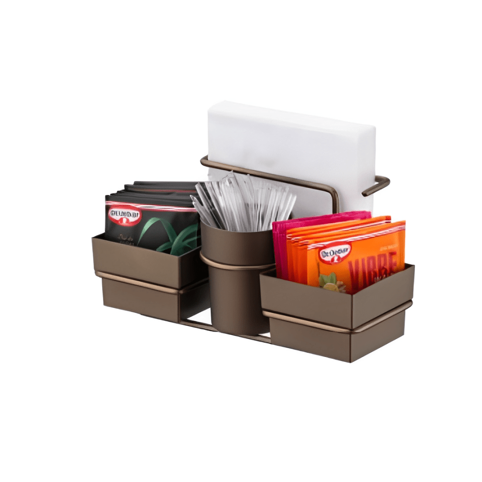 Se você quer um cantinho do café funcional, bonito e bem organizado, o Organizador para Sachês, Mexedor e Guardanapo na cor Marrom Café é o item essencial para deixar tudo no lugar com muito charme.