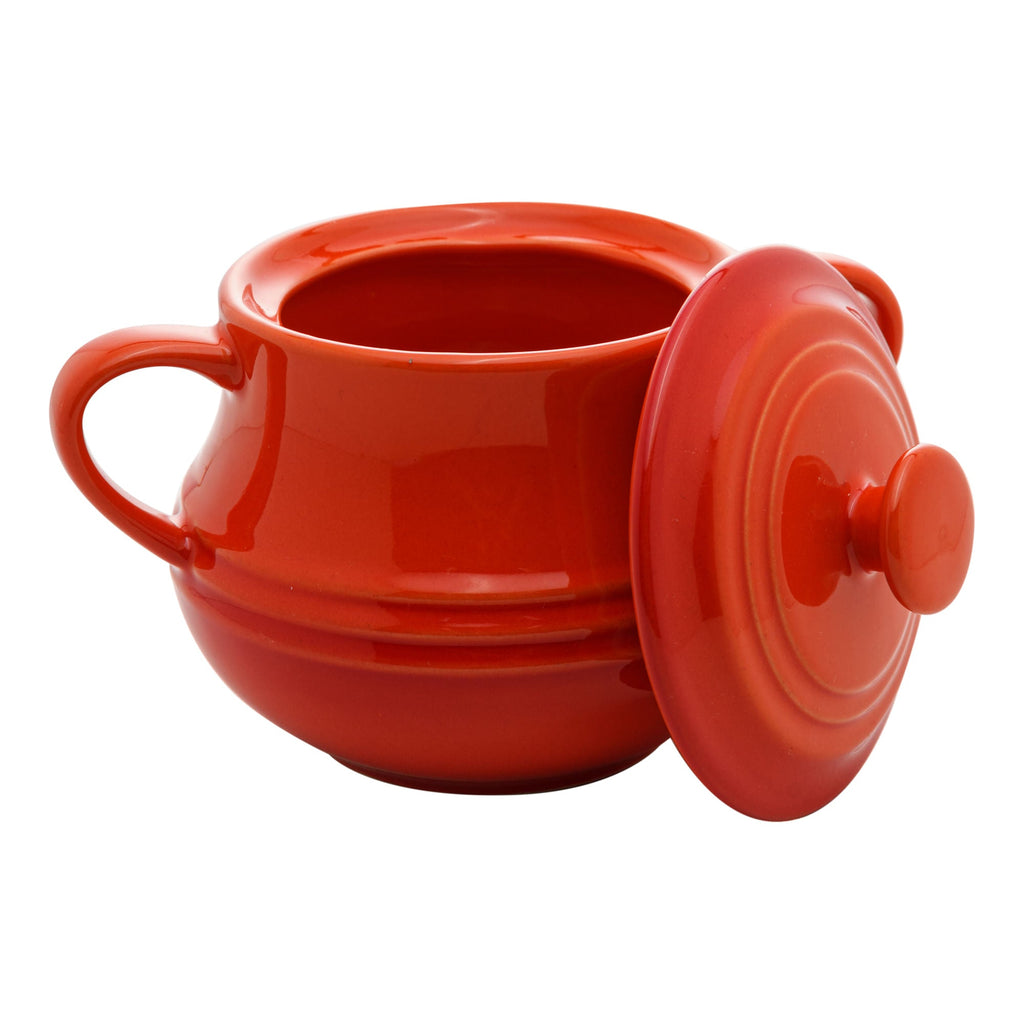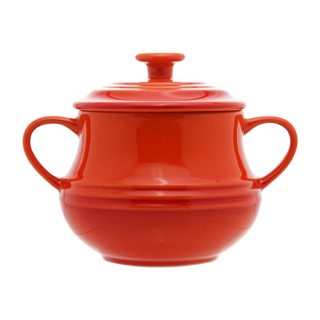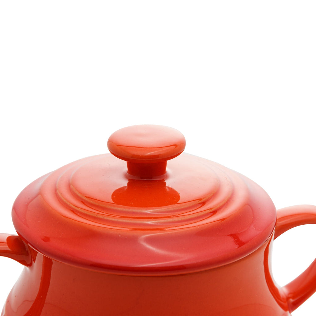 - Confeccionada em cerâmica de alta qualidade com acabamento laranja, esse pote ainda possui uma tampa que protege seu alimento e alças ergonômicas que ajudam no deslocamento.