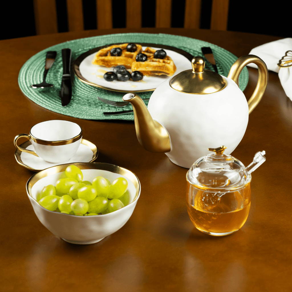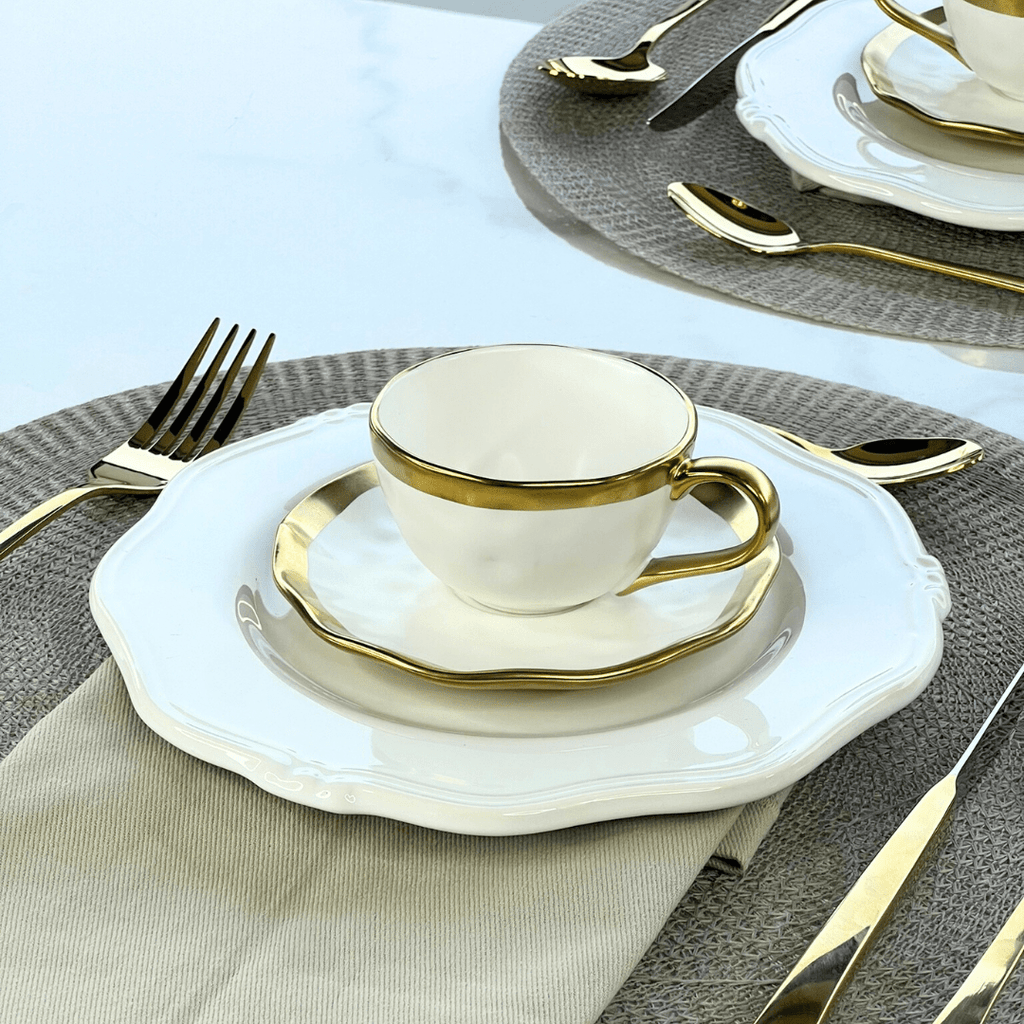 • O dourado é um tom que simboliza prosperidade e riqueza, junto do branco, essa xícara com pires é uma peça única.